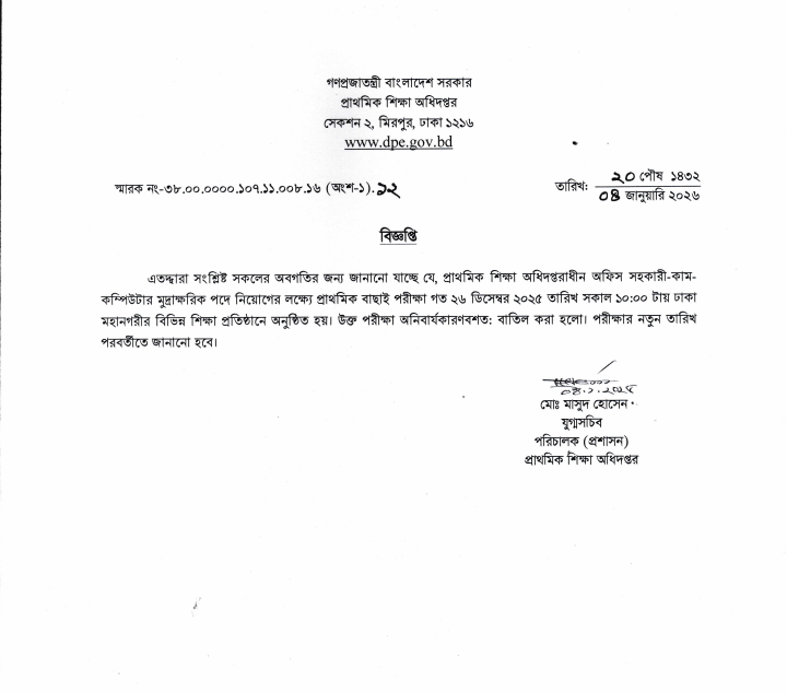 বিজ্ঞপ্তিতে বলা হয়েছে, প্রাথমিক শিক্ষা অধিদপ্তরাধীন অফিস সহকারী কাম কম্পিউটার মুদ্রাক্ষরিক পদে নিয়োগের লক্ষে প্রাথমিক বাছাই পরীক্ষা গত ২৬ ডিসেম্বর সকাল ১০টায় ঢাকা মহানগরীর বিভিন্ন শিক্ষাপ্রতিষ্ঠানে অনুষ্ঠিত হয়। এই পরীক্ষা বাতিল করা হলো।