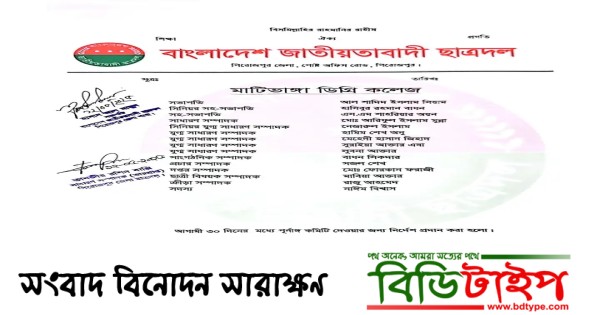 পিরোজপুর জেলা নাজিরপুর উপজেলা ঐতিহ্যবাহী মাটিভাংগা ডিগ্রি কলেজ ছাত্রদলের নতুন কমিটি গঠন হইছে উক্ত কমিটির সভাপতি উক্ত কলেজ ডিগ্রি প্রথম বর্ষের ছাত্র আল সাদিদ ইসলাম সিয়াম সিনিয়র সহ সভাপতি হাসিবুল ইসলাম বাধান ১নং সহ সভাপতি আয়ন সাধারন সম্পাদক আরিফুল ইসলাম মুন্না সিনিয়র যুগ্ম সাধারন সম্পাদক নেজারুল ইসলাম রনি সহ যুগ্ম সাধারন সম্পাদক অনু, জিহাদের, সুরাইয়া, লুবনা। উক্ত কমিটি সাংগঠনিক সম্পাদক দায়িত্ব পান বাধান সরদার। উক্ত কমিটির সভাপতি আল সাদিদ ইসলাম সিয়াম বলেন আমরা কলেজ উন্নয়ন অগ্রগতি জন্য সব সময় কাজ করবো সাধারন সম্পাদক বলেন কলেজ ছাত্রদের জন্য মাটিভাংগা ডিগ্রি কলেজ ছাত্রদল সব সময় কাজ করবে সিনিয়র যুগ্ম সাধারণ সম্পাদক নেজারুল ইসলাম রনি বলে আমরা সবাই কাঁধে কাঁধ মিলেয়ে কলেজ অগ্রযাত্রা এগিয়ে এবং কলেজ উন্নয়ন কাজ করবো।